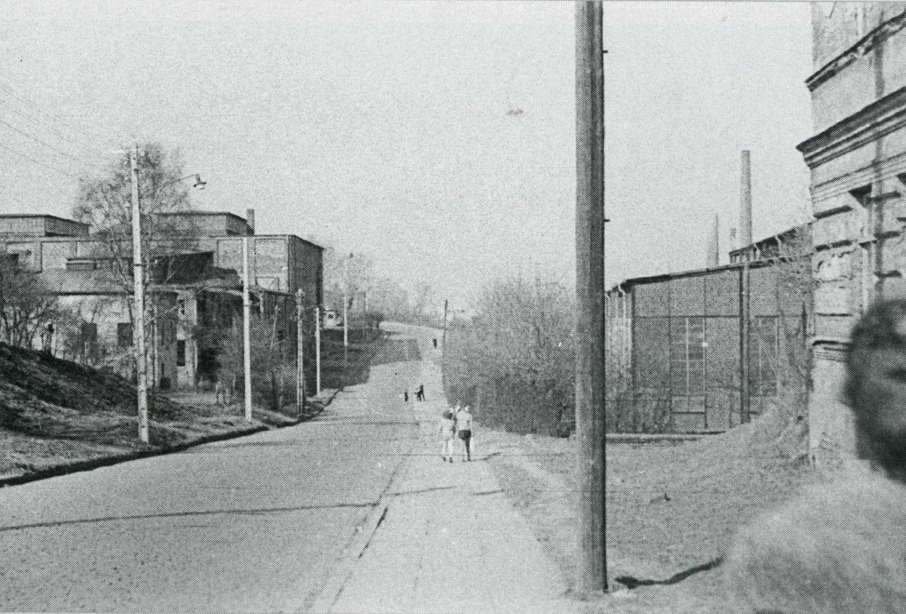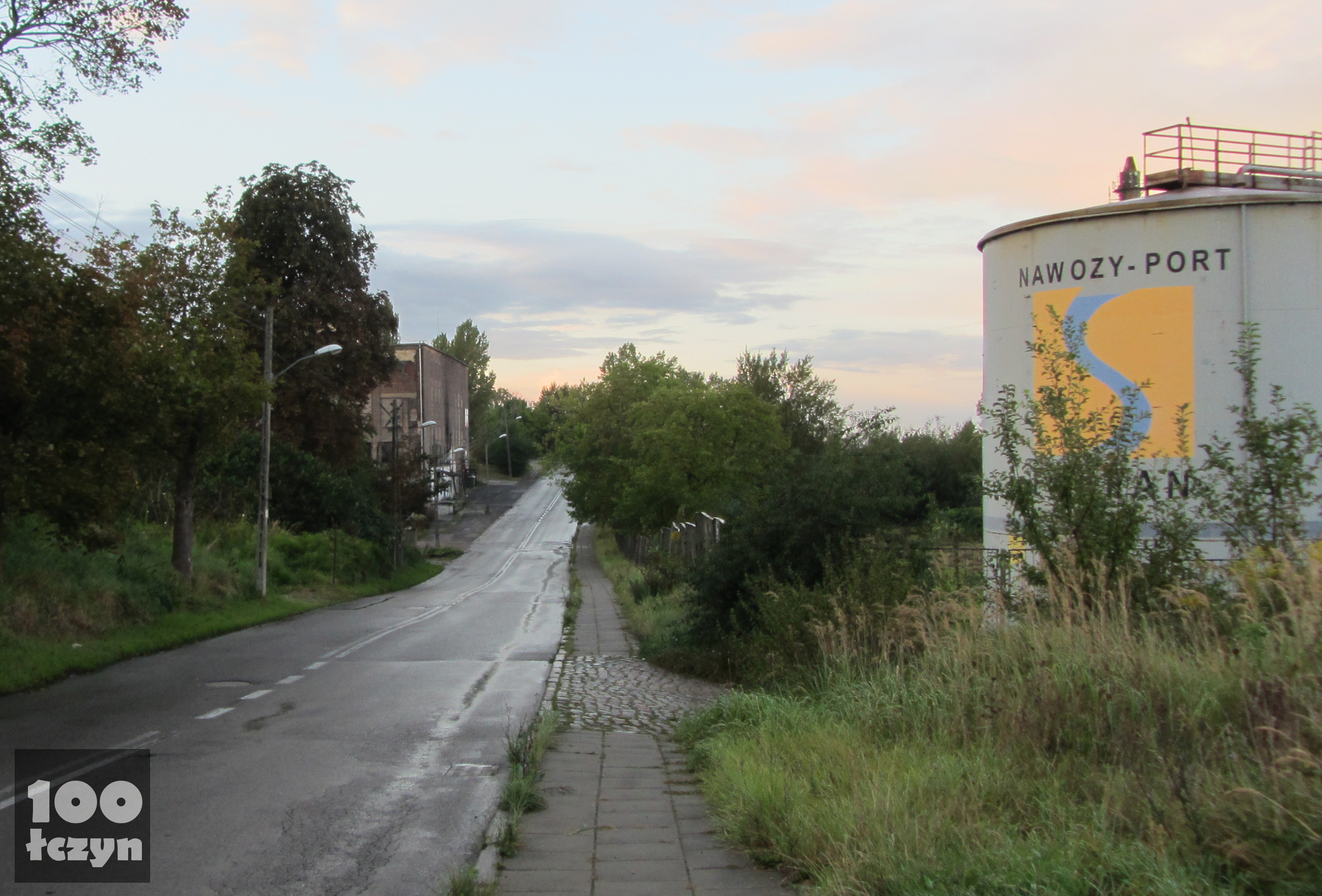 Co się zmieniło w tym krajobrazie? Widoczna po lewej stronie kamienica, która została wyburzona nie tak dawno temu, stoi jeszcze na Google Street View, o czym napisałam we wcześniejszym wpisie. Inaczej są poustawiane słupy elektryczne wzdłuż ulicy. Zniknęły też dwie hale fabryczne. Tę po lewej stronie zastąpiły silosy Fosfanu, zaś po tej po prawej zostały wciąż widoczne jeszcze fragmenty fundamentów i przyziemia. Całą okolicę porasta gęsta roślinność. No i ludzi teraz jakby mniej…