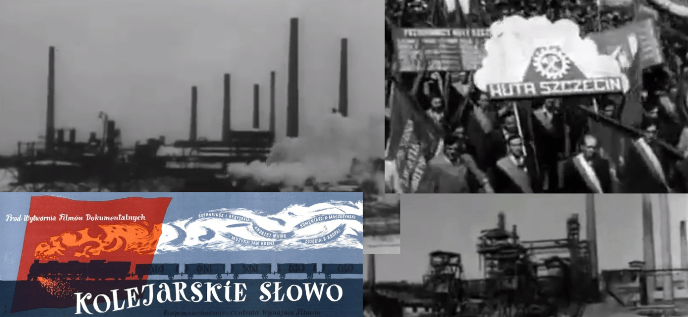 Nieco dłuższe ujęcia pochodzą natomiast z filmu „Kolejarskie Słowo”. To film dokumentalny w reżyserii Andrzeja Munka, znanego m.in. z takich produkcji jak „Człowiek na torze” czy „Zezowate Szczęście”. Klimat filmu pochodzącego z 1953 r., idealnie oddaje ducha czasu. Treść dokumentu to droga pociągu towarowego wiozącego ładunek koksu ze Śląska do Huty Szczecin. Na początku i na końcu filmu pojawia się punkt końcowy tej dramatycznej walki z czasem i przestrzenią – Huta Szczecin.