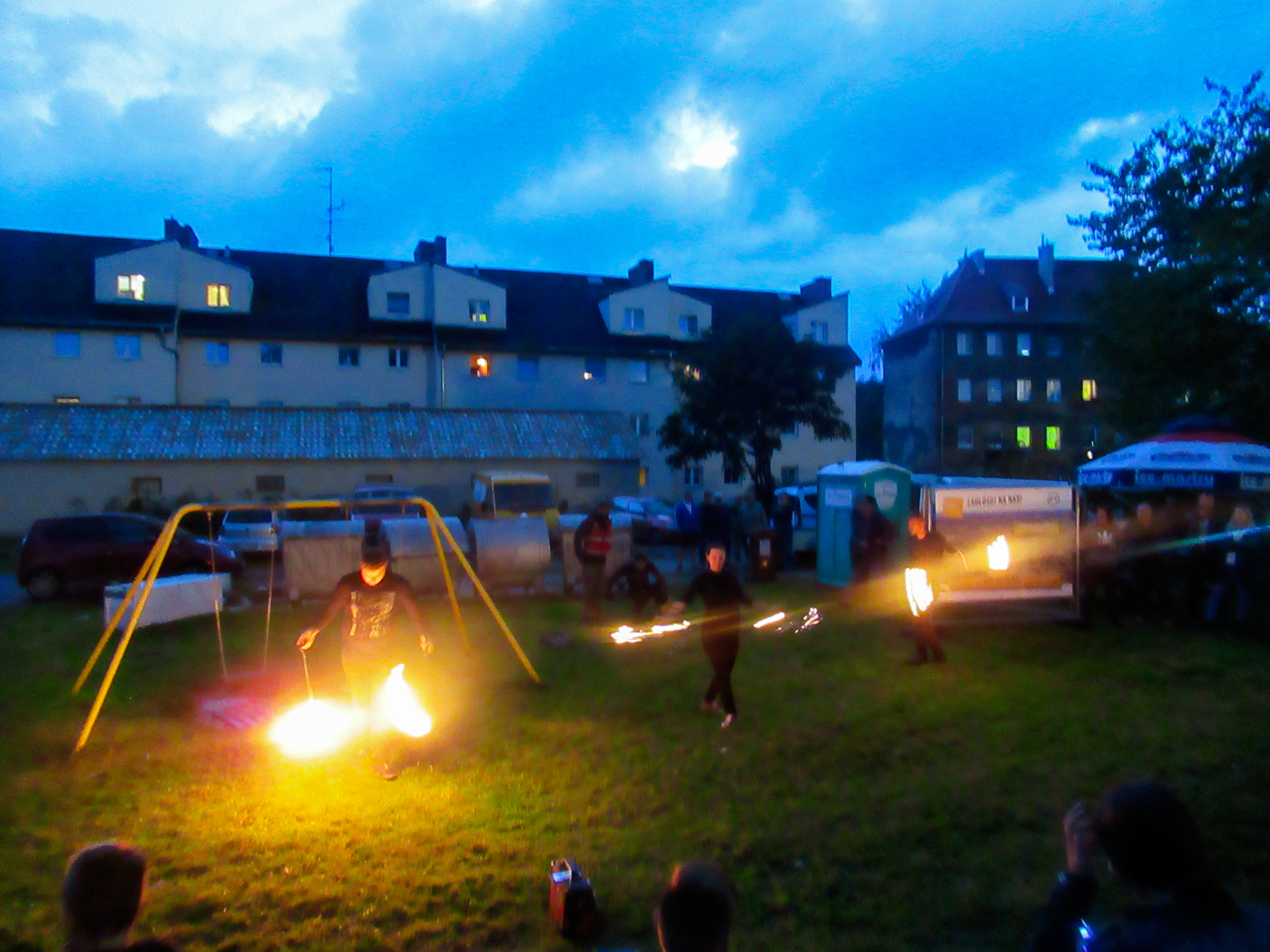 Około godziny 18 deszcz ustał i na polanie pojawiło się więcej mieszkańców z dziećmi. Wszyscy w napięciu czekali na pokaz ognia w wykonaniu grupy Outcast Flame Fireshow, który był punktem kulminacyjnym festynu i wymarzonym zamknięciem. Członkowie grupy tańczącej z ogniem zrobili ogromne wrażenie na zgromadzonych i tym ognistym akcentem zamknęli imprezę.