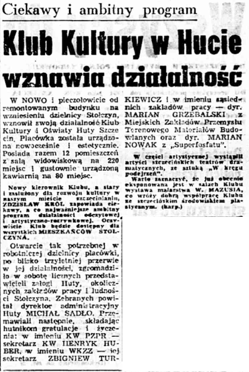Remont trwał trzy lata. 11 stycznia 1964 r. Dom Kultury Huty „Szczecin” został otwarty na nowo, tym razem pod nazwą Klubu Oświaty i Kultury Huty „Szczecin”. Z nowym kierownikiem, który już na stałe wpisał się do historii tego miejsca. Zdzisław Król, bo o nim mowa, to postać niebanalna. W 1962 r., przy Szczecińskich Zakładach Celulozowo – Papierniczych w Skolwinie założył zespół piosenki i tańca „Dzieci ze Skolwina”. Kiedy Huta „Szczecin” otworzyła po remoncie Dom Kultury na Stołczynie przy ul. Kościelnej 51, Zdzisław Król przeniósł się na Stołczyn.