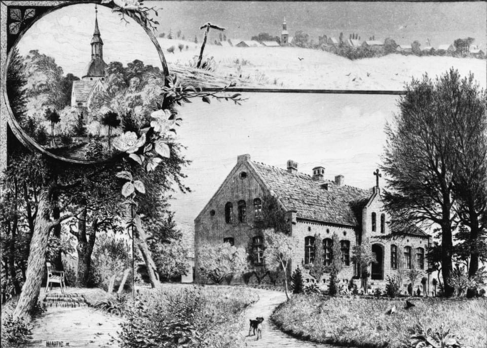 Na litografii tej oprócz plebanii widzimy ogród parafialny od strony kościoła. W górnej części znajduje się sylwetka kościół z iglicą sprzed pożaru w 1920 r. oraz panorama na zabudowę wsi. Znany jest jeszcze jeden obraz z widokiem drogi na Julo (dzisiejsze Zielone Wzgórze):