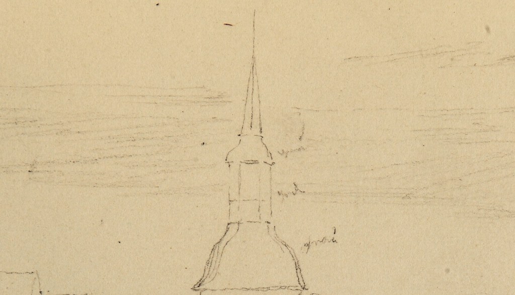 Widok na szkicu to obecna ulica Nehringa od strony skrzyżowania z ul. Policką. Na pierwszy rzut oka nie rozpoznajemy tutaj znanego nam widoku. Musimy jednak pamiętać, że to rok 1838 i stołczyński kościół wyglądał wtedy inaczej. Miał strzelistą wieżę z iglicą, którą stracił w pożarze w 1920 r. I taką widać na szkicu Ludwiga Mosta.